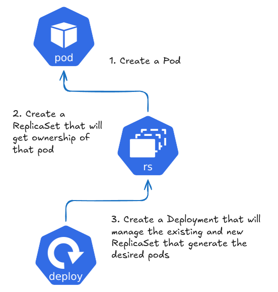 In this practice, we are going to explore these ownership relationships by doing the opposite path of the usual workflow by first creating the pod, then a ReplicaSet that will manage that existing pod and at last a Deployment to manage that existing ReplicaSet.