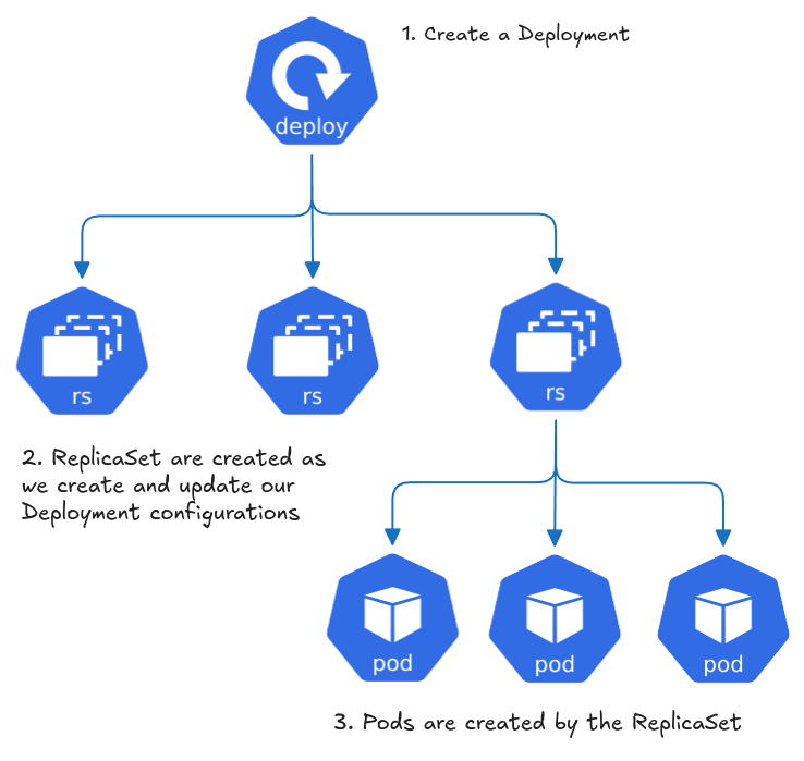 The usual workflow of creating workloads in Kubernetes is to create a Deployment which manages multiple ReplicaSets which in turn creates and manages the desired pods.